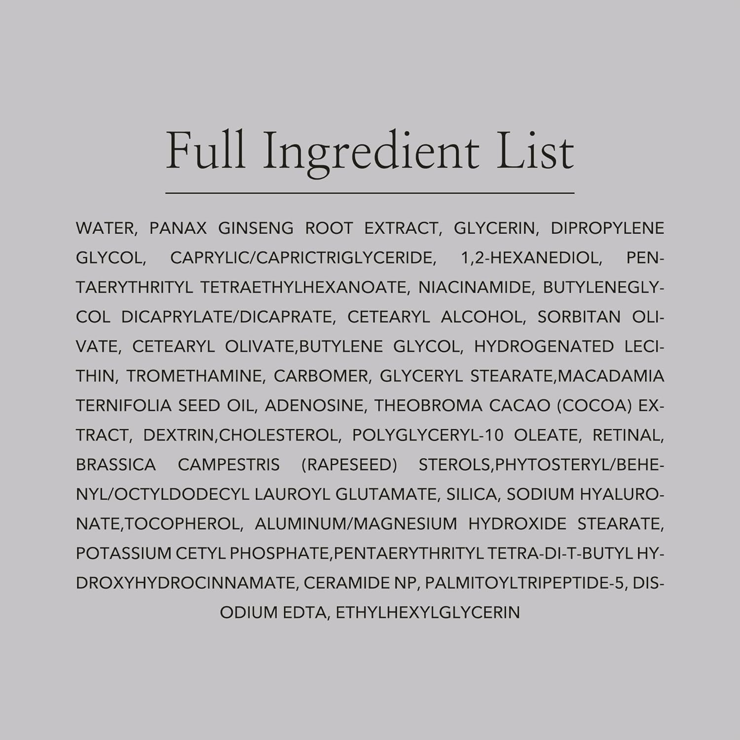 Key Ingredients: Ginseng Extract for skin elasticity and protection, Retinal for reduction of wrinkles and Niacinamide for brightness